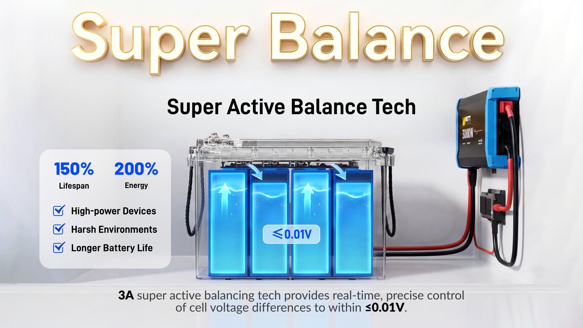 100X Faster Active Balancing: WattCycle 12V 314Ah Mini Super Lithium Battery is equipped with a 3A active balancing. Compared to 0.03A passive balancing, active balancing has significant advantages in improving energy efficiency, extending battery life, and enhancing overall performance. It is especially suitable for applications with high requirements for performance and lifespan, such as sailboats, home energy systems, and campervans.