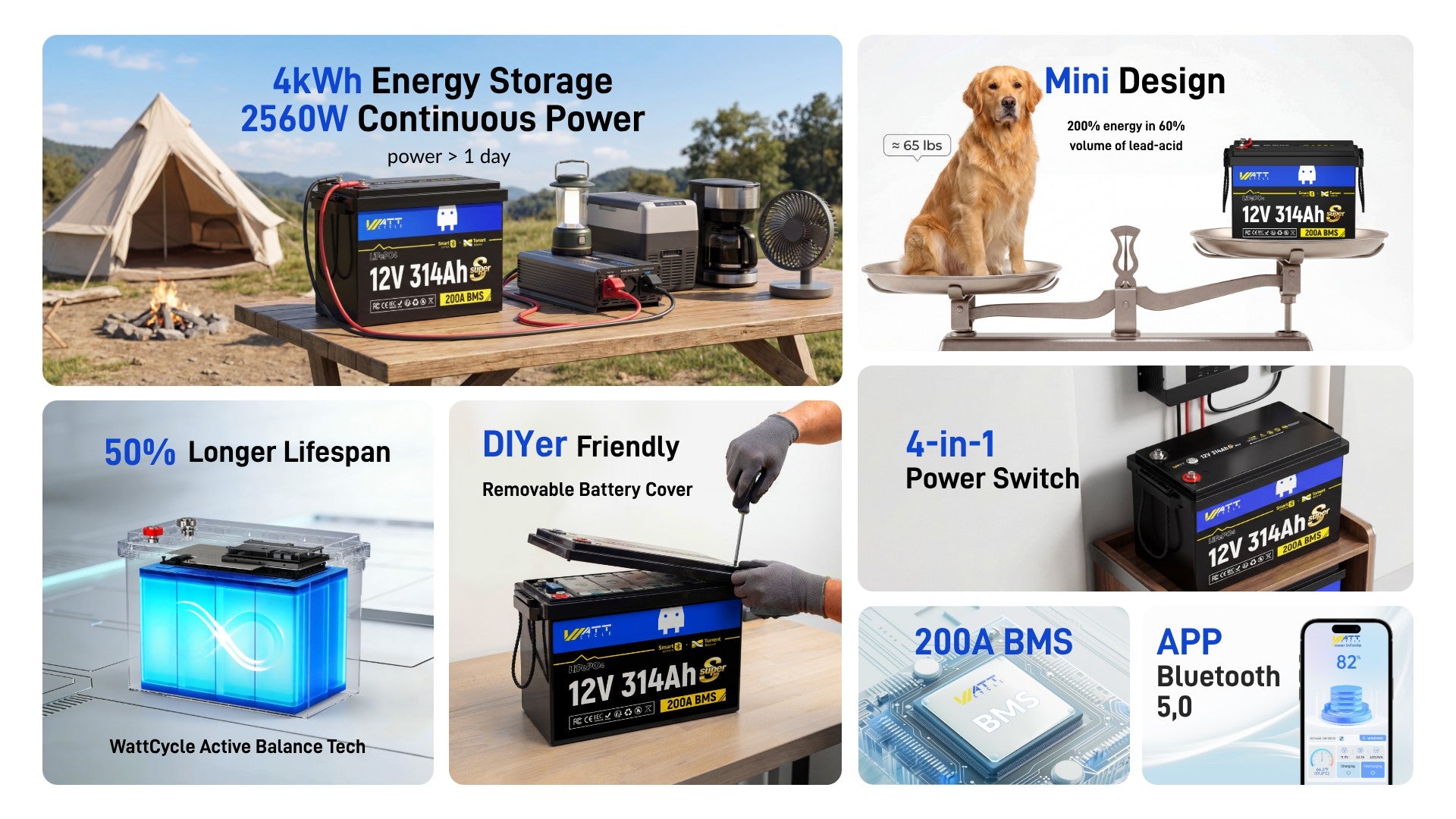 6000+ Cycles for 10+ Years of Use: Built with EV Grade A+ prismatic LiFePO4 cells, this 12V 314Ah Mini Super Bluetooth Lithium Battery delivers 6000+ cycles @ 80% DoD, offering a significantly longer lifespan than conventional lead-acid batteries. Over time, the extended durability and higher efficiency translate into lower cost per cycle and better long-term value.