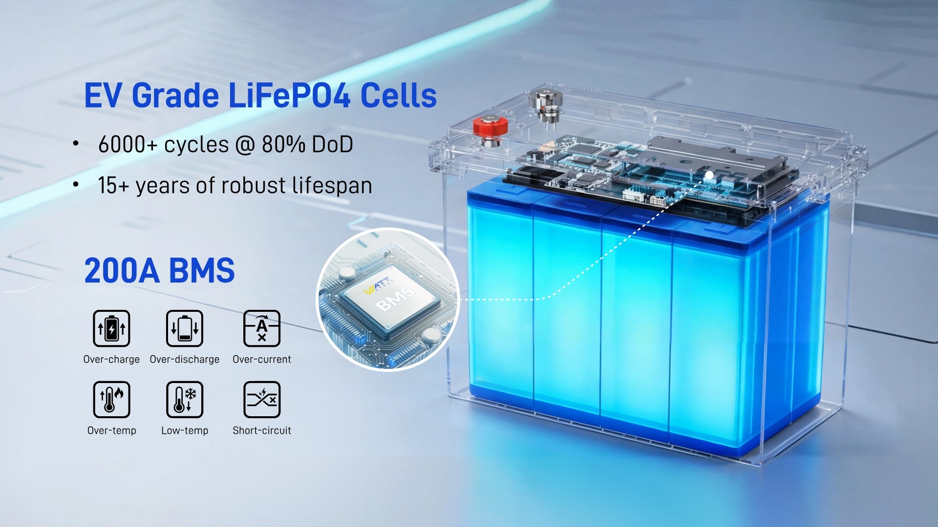 Advanced 200A Smart BMS Protection: Supports 210A±10A peak discharge current @ 10s and provides 20+ safety protections to ensure stable, safe performance even under heavy loads.