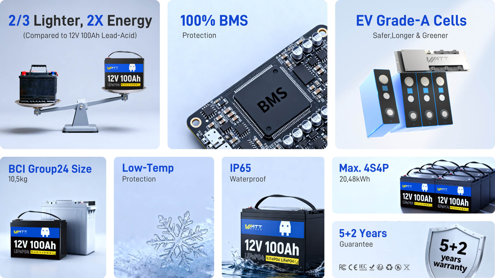 EV Grade A+ LiFePO4 Cells: WattCycle 12V 100Ah deep cycle LiFePO4 battery is equipped with EV grade A+ battery cells, which provide more than 5000+ cycle life and a lifespan of 10 years. Compared with lead-acid batteries, WattCycle LiFePO4 batteries are non-toxic and eco-friendly, offer higher chemical stability, and guarantee quality and safety.