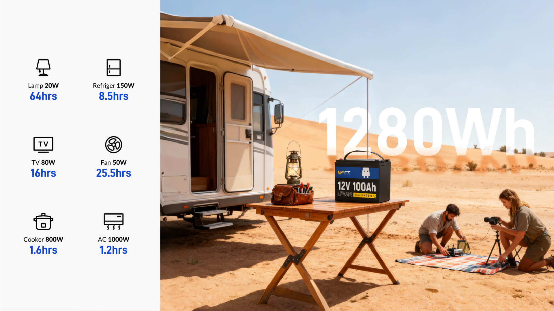 High Capacity & Lightweight: WattCycle 12V 100Ah lithium battery, with its 1280W continuous output power and 1280Wh energy, weighs only 10.50kg. Its energy density is 121.90Wh/kg, while that of 12V 100Ah lead-acid batteries is 27.40Wh/kg.
