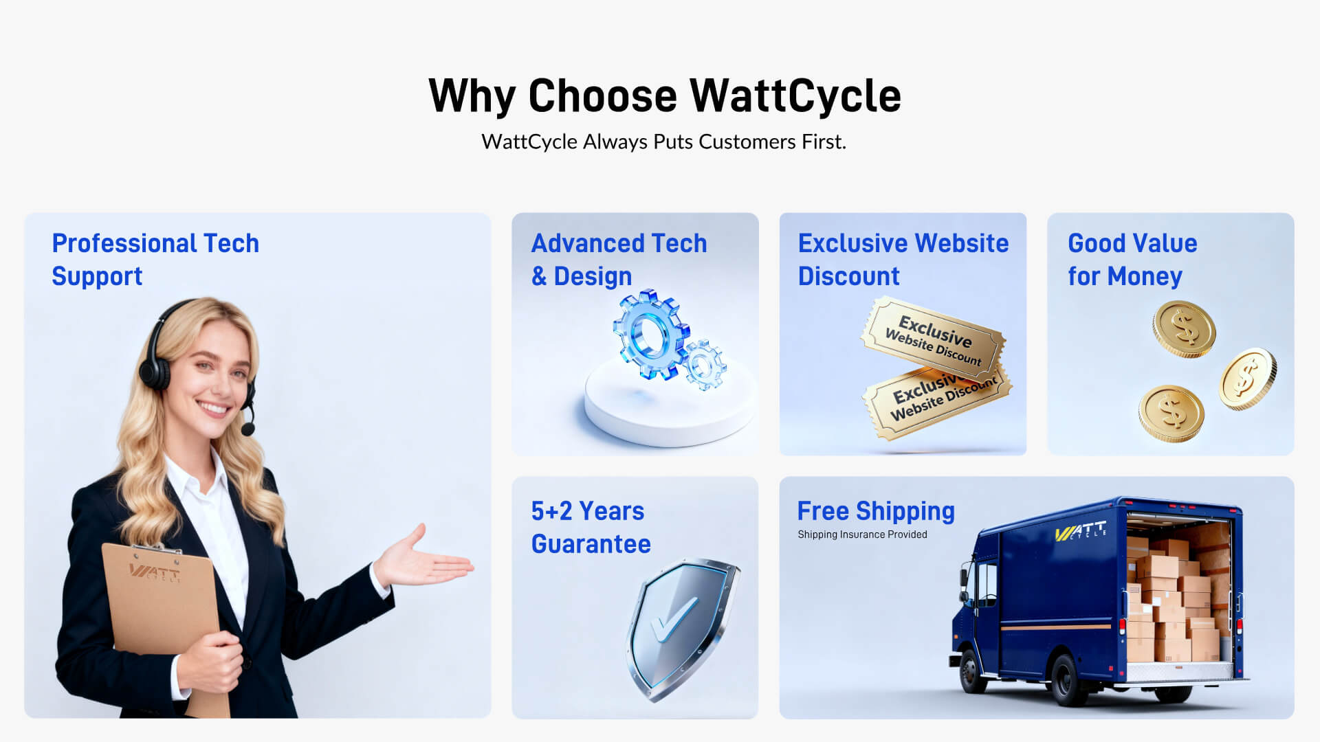 Please feel free to contact us via Email (support.eu@wattcycle.com) or WhatsApp(+86 153 6140 9198).
